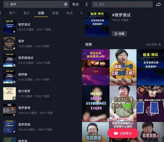 截止目前,B站#塔罗#话题浏览量超过1600万,而抖音#塔罗测试#话题已经累计8.5w个视频,播放量突破19亿次,其他塔罗相关话题的播放量也都居高不下。