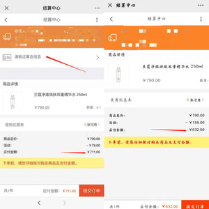 “不过,由于VIP账号显示的商品价格确实比其他渠道都便宜,因此,收到货后我就又陆续下了几单。前后共消费了5000元左右。”在刘女士购买的第二批商品中,补购商城中的娇韵诗双萃焕活修护精华露套装(一套)的折后实付价为1613.3元;而三亚国际免税城官方商城售价则为1898元/套,购买需满三件才可享受8.5折促销优惠(折扣价为1613.3元)。而在商场专柜,该套装售价为2920元,满减优惠后价格为2620元/套。