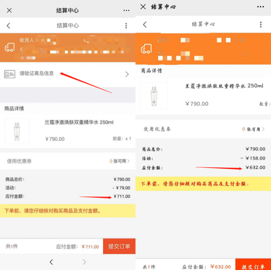 最初,刘女士下单了一款“娇韵诗焕颜弹力晚安霜”。这件商品在海南离岛补购官方商城上的价格显示为610元/瓶(50ml)、折后实付价格为518.5元。而同样一款产品在娇韵诗淘宝官方旗舰店及北京中心城区某商场专柜上售价均为780元/瓶,而且还没有任何折扣;而在同样销售离岛免税商品的三亚国际免税城官方商城上,这款产品的售价同样是610元/瓶(50ml)但暂时缺货。