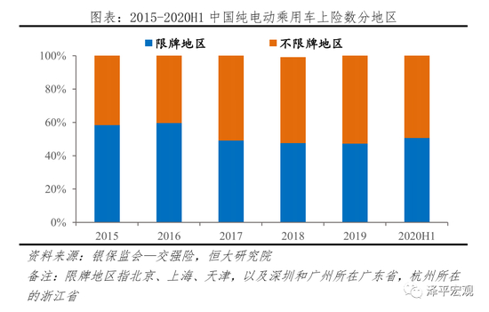 限牌地区销量占比呈下降趋势,市场化因素加强。据乘用车交强险数据统计,2015-2020H1我国限牌地区新能源乘用车上险数占比分别为58.6%、59.8%、49.2%、47.6%、47.4%、50.8%,整体呈下滑趋势。2020H1由于疫情因素,限牌地区销量占比短暂提升。