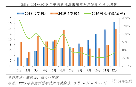 1)政策端:财政补贴大幅退坡,变向提升电动车购置成本。2019年补贴新政相较2018版整体退坡近50%。2019年补贴过渡期(3-6月)后,我国新能源乘用车销量呈断崖式下滑。2019年1-12月度销量同比增速分别183.5%、74.4%、100.8%、28.3%、5.4%、97.5%、-7.0%、-16.0%、-33.4%、-45.4%、-42.0%、-16.1%。