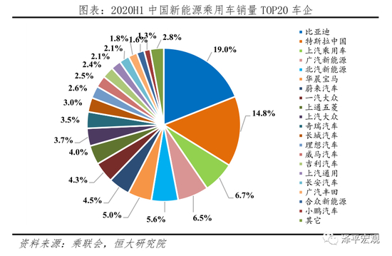 据乘联会统计,2020H1我国纯电动乘用车销售25.0万辆,TOP10车型分别为Model 3、全新秦EV、Aion S、宝骏E100、北汽EU系列、蔚来ES6、奇瑞eQ、欧拉R1、比亚迪元EV、威马EX5,对应市场占比分别为18.3%、8.2%、7.3%、5.4%、4.7%、4.7%、3.9%、3.7%、3.4%、3.0%,合计占比62.5%;其中特斯拉Model 3一枝独秀,占比超过二、三名之和。