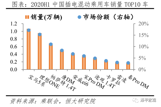 据乘联会统计,2020H1我国插电混动乘用车销售6.2万辆,TOP10车型分别为宝马5系PHEV、理想ONE、帕萨特1.4T PHEV、比亚迪唐DM、荣威ei6、比亚迪宋Pro DM、途观1.4T PHEV、卡罗拉PHEV、雷凌PHEV、比亚迪秦Pro DM,对应市场占比分别为17.1%、15.3%、11.0%、8.3%、6.8%、5.9%、4.9%、3.8%、3.1%、2.9%,合计占比79.0%;其中宝马5系、理想ONE占比超过15%,插电混动畅销车型外(合)资占有5款。