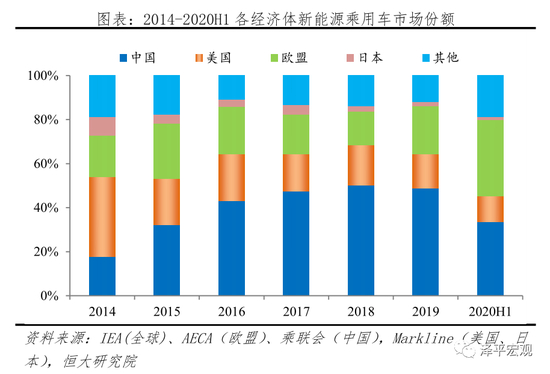 据Markline统计,2020年上半年全球新能源乘用车(BEV+PHEV)销量为97.4万辆,其中中国、美国、欧盟、日本、其它国家分别销售31.3、11.0、32.4、1.2、17.5万辆,对应分别占比33.5%、11.8%、34.7%、1.3%、18.8%。欧盟地区市场份额2020年上半年剧增,从2019年21.9%直接提升到2020年上半年34.7%,市场份额反超中国;中国地区市场份额从2018年50.2%下滑到2019年48.8%、2020上半年33.5%,先发优势在缩小。