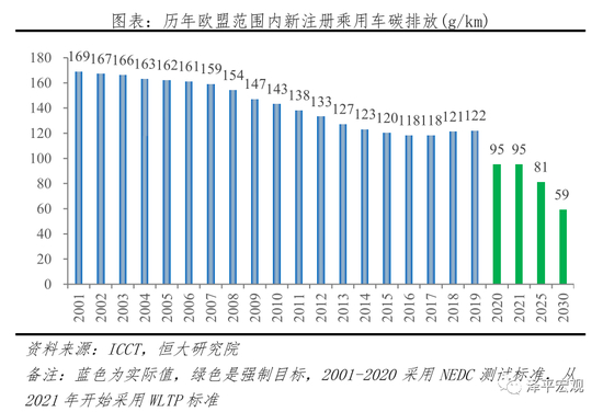 1)欧盟层面:欧盟出台史上最严碳排放法规。2019年4月,欧盟发布《2019/631文件》,规定2025、2030年新登记乘用车CO2排放在2021年(95g/km)基础上分别减少15%(81g/km)、37.5%(59 g/km),每超标1g/km罚款95€。如下图所示,据ICCT披露,欧盟乘用车实际碳排放从2001年169g/km下降到2019年122g/km,累计降幅27.8%,年平均降幅仅1.8%。2019年欧盟范围内注册新乘用车销售1531.8万辆;假设2020年碳排放和销量保持不变,需要罚款(122-95)×1531.8万辆×95€=392.9亿欧元,约3182.5亿元(按汇率8.1计算)。