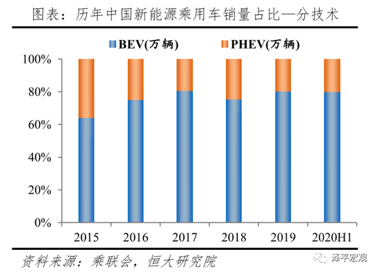 据乘联会统计,受疫情影响,2020年上半年中国纯电动和插电混动乘用车分别销售25.0和6.2万辆,同比增速分别为-45.2%和-44.3%,对应市场占比分别为80.1%和19.9%。纯电动和插电混动乘用车自2016年起两者市场占比较为稳定,一直在8:2左右。