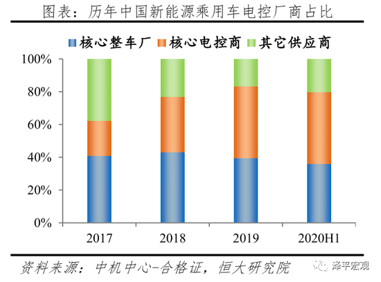 电控供应商按照背景也可细分成:核心整车厂、核心电控商、其它供应商。据中机中心合格证数据统计,2020H1我国新能源乘用车电机合计配套34.9万套,其中核心整车厂、核心电控厂、其它厂商市场占比分别为36.2%、43.6%、20.1%;从近几年趋势看,核心电控厂市场份额从2017年21.2%提升到2020H1的43.6%,增加22.4个百分点。