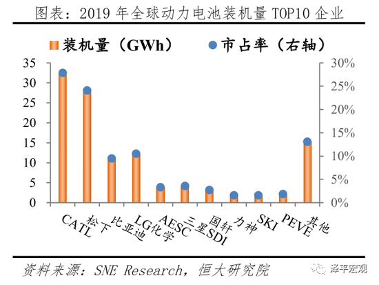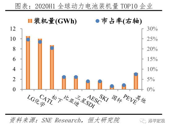 市场高度集中,中日韩三足鼎立,本土动力电池厂商已处于全球第一阵营。据SNE Research披露,2020H1全球动力电池装机量42.6Gwh,其中TOP10厂商分别为LG化学、CATL、松下、比亚迪、三星SDI、AESC、SKI、国轩、PEVE及其它,分别24.6%、23.5%、20.4%、6.1%、6.1%、4.0%、4.0%、1.6%、2.1%、7.5%;其中LG化学、CATL、松下市场占比远高于其它厂商,合计占比68.5%。2020上半年值得注意的是,LG化学全球市场份额反超CATL,位居第一,相比2019年市场份额(10.5%)增加14.1百分点,主要原因在于国产特斯拉放量。按照合格证数据统计,2020上半年LG化学为国内特斯拉装机量2.5Gwh,占LG化学总装机量的23.8%。