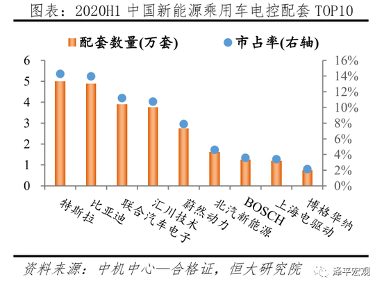 电机控制器是新能源汽车中连接电池与电机的电能转换单元。据中机中心合格证数据统计,2020H1我国新能源乘用车电控合计配套34.9万套,配套量TOP10厂商分别为特斯拉、比亚迪、联合汽车电子、汇川技术、蔚然动力、北汽新能源、BOSCH、上海电驱动、博格华纳、德尔福,对应市场占比分别为14.3%、14.0%、11.2%、10.7%、7.9%、4.6%、3.6%、3.4%、2.1%、2.1%,合计占比73.8%;其中本土厂商前10名占有6席,合计占比51.8%。