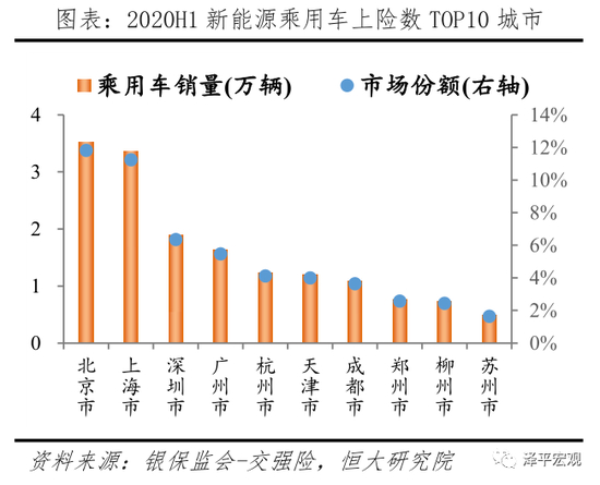 当前新能源乘用车主要集中在一二线、限牌城市。据乘用车交强险数据统计,2020年上半年中国新能源乘用车上险数29.8万辆,其中上险数TOP10城市分别为:北京、上海、深圳、广州、杭州、天津、成都、郑州、柳州、苏州;上险数分别为3.5、3.4、1.9、1.6、1.2、1.2、1.1、0.8、0.7、0.5万辆;对应市场占比分别为11.8%、11.3%、6.4%、5.5%、4.1%、4.0%、3.6%、2.6%、2.4%、1.7%,合计占比53.4%。其中前六名皆为限牌城市,合计占比43.1%。从区域分布来看,高度集中于东南地区。