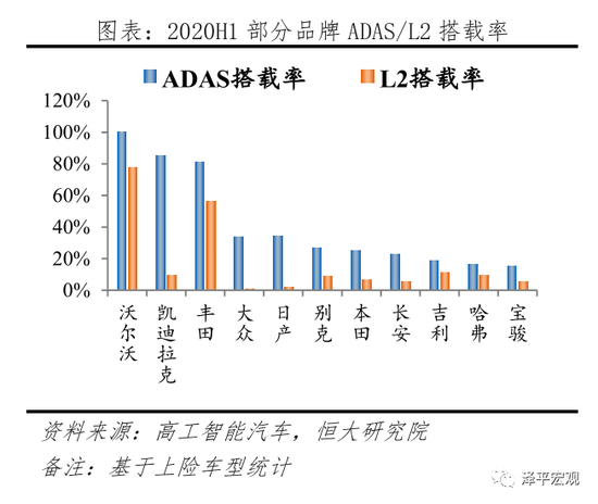 据高工智能汽车统计,2020H1中国部分品牌,如沃尔沃、凯迪拉克、丰田、长安、吉利汽车新车ADAS搭载率分别为100.0%、85.0%、81.0%、22.8%、18.5%,其中新车达到L2级别占比分别为77.6%、9.3%、56.3%5.5%、11.1%;不同品牌车型智能化水平差别较大。ADAS代表功能方面,据高工智能汽车统计,2020H1中国乘用车部分ADAS功能,如LDW(车道偏离预警)、AEB(自动紧急制动)、ACC(自适应巡航控制)、全速ACC、APA(自动泊车辅助)、AVM(全景影像监测)、LKA(车道保持辅助)搭载率分别为19.2%、30.2%、4.8%、12.4%、11.1%、14.8%、13.1%;相比2019H1均有较大提升,渗透明显提速。