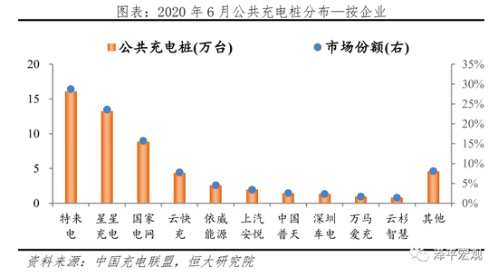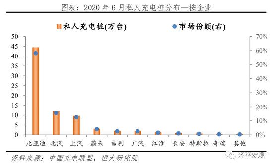据中国充电联盟披露,截至2020年6月,我国私人充电桩保有量76.3万台;私人桩保有量TOP10运营商分别为比亚迪、北汽、上汽、蔚来、吉利、广汽、江淮、长安、特斯拉、奇瑞,对应占比分别为58.2%、15.6%、12.5%、4.2%、2.6%、2.6%、1.6%、1.1%、0.8%、0.5%,合计占比99.6%;其中比亚迪一家占比过半。