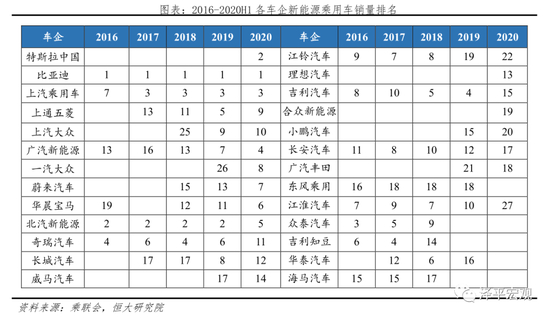 新能源乘用车生产企业按照背景可分为三大阵营:传统自主品牌、本土造车新势力、外(合)资品牌。据乘联会统计,2020H1销量TOP20车企从高到低分别为:比亚迪、特斯拉、上汽乘用车、广汽新能源、北汽新能源、华晨宝马、蔚来、一汽大众、上通五菱、上汽大众、奇瑞、长城、理想、威马、吉利、上汽通用、长安、广汽丰田、合众、小鹏;对应市场占比19.0%、14.8%、6.7%、6.5%、5.6%、5.0%、4.5%、4.3%、4.0%、3.7%、3.5%、3.0%、2.6%、2.5%、2.4%、2.1%、2.1%、1.8%、1.6%、1.3%;合计占比97.2%。其中传统自主品牌8家,合计占比48.8%;本土造车新势力5家,合计占比12.5%;外(合)资品牌7家,合计占比35.9%。