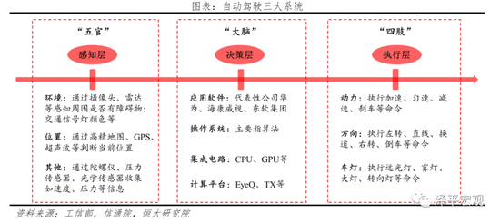 自动驾驶按功能可划分为:感知系统(环境感知与定位)、决策系统(智能规划与决策)、执行系统(控制执行)三大核心模块。自动驾驶系统最终是为了取代人,如果将其类比人的话,如下图所示:感知层相当于人的五官,感知周围的环境,搜集数据传输到决策层;决策层相当于人的大脑,处理感知层传输的数据,输出相应的执行指令给执行层;执行层相当于人的四肢,执行大脑给出的指令。其中感知层主要包括三部分,环境感知、位置感知和速度、压力等其它感知。