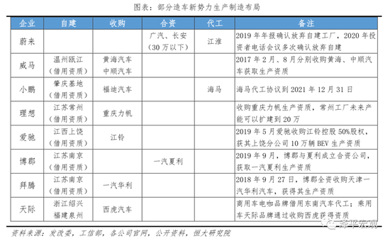 3)市场准入:外资准入放开,生产准入趋严。新能源汽车市场准入主要有两个,一个是外资准入,一个是生产资质。外资准入方面,2018年6月国家发改委和商务部发布《外商投资准入特别管理措施(负面清单)(2018年版)》提出,2018年起取消专用车、新能源汽车中方股比不低于50%限制,同一家外商可在国内建立两家及两家以下生产同类整车产品的合资企业。生产资质方面,发改委和工信部分别通过《汽车产业投资管理规定》和《新能源汽车生产企业及产品准入管理规定》管理纯电动汽车整车生产资质。其中发改委负责审批纯电动汽车整车生产工厂能否建设,工信部负责审核纯电动汽车能否生产,分别类似于计划生育政策的准生证和出生证。正是由于生产资质限制,国内造车新势力基本都是通过代工和收购方式实现新能源乘用车生产,具体如下表所示。