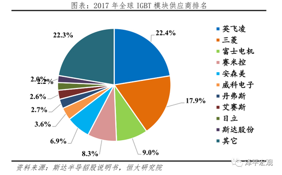 当前我国电机控制器技术相对落后,主要在于核心零部件IGBT高度依赖进口(约90%)。据国内IGBT龙头斯达半导招股说明书披露,2017年全球IGBT供应商市场份额,英飞凌22.4%、三菱17.9%、富士电机 9.0%、赛米控8.3%、安森美6.9%、威科电子3.6%、丹弗斯2.7%、艾赛斯2.6%、日立2.2%、斯达股份2.0%;前10名本土只有1位,居末席,仅有2%。