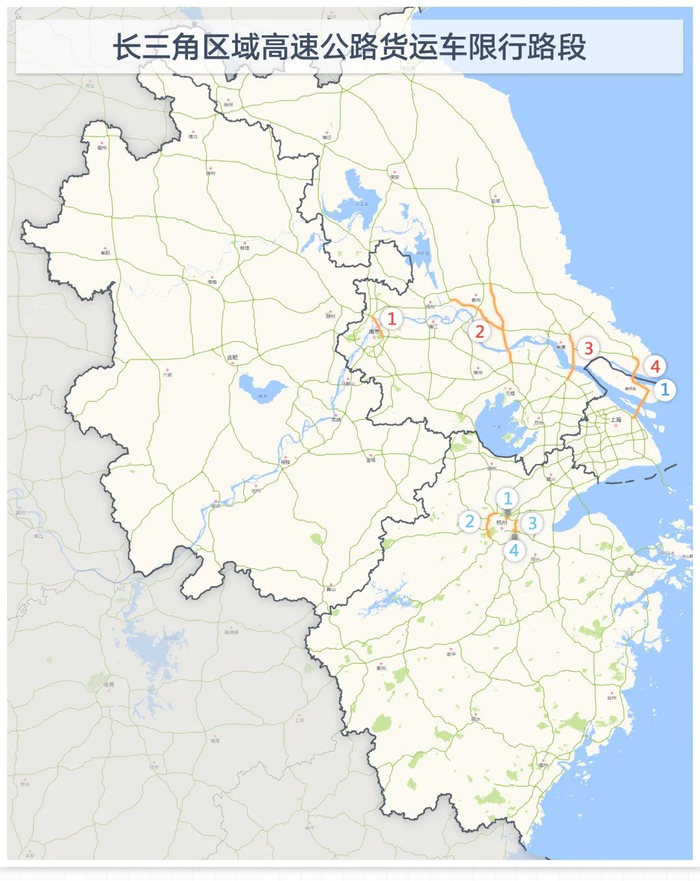 节日期间,长三角区域高速公路共有9个高速路段分时段对货运车(黄牌或中型以上货车)施行限行政策,其中: