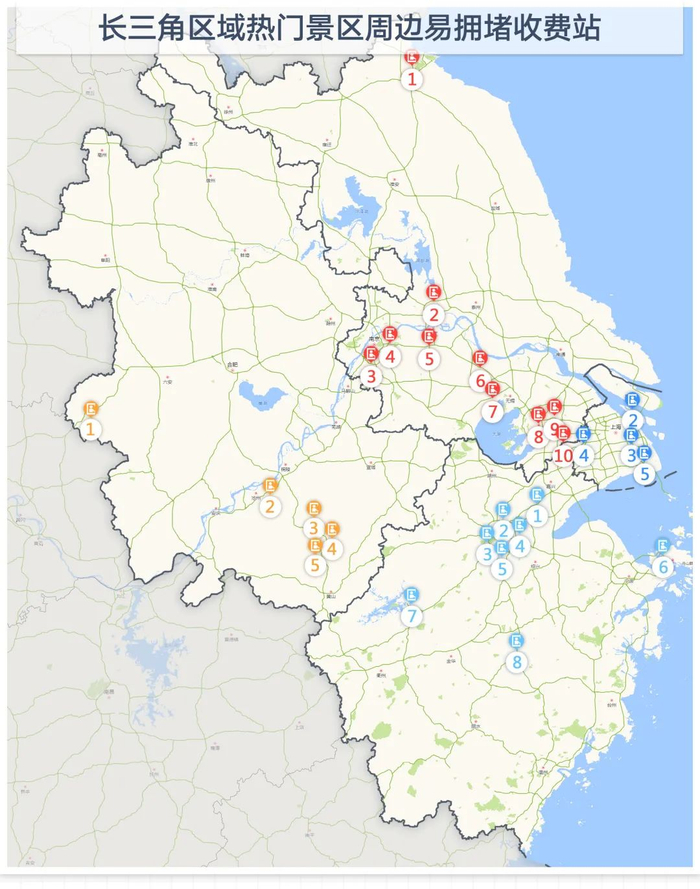 与热门景点相关联、易拥堵的收费站有25个,其中江苏10个,上海、浙江、安徽各5个。公众在前往热门景区前,请提前了解和查询景区疫情防控、开放、门票预约、客流限制等措施,做到“无预约、不出游”,错峰出行;并配合景区工作人员落实防控检测工作,在封闭场所和人流密集场所请佩戴口罩,人多避拥挤,并保持一米以上社交距离。