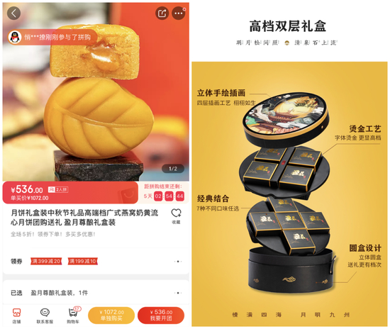 而另一款名为“广式燕窝奶黄流心月饼 盈月尊酿礼盒装”的月饼,团购售价同样为536元,单买价格为1072元。记者看到,在该款商品的购买页面不断出现部分消费者已参与团购的提示,而在商品详情页更是刻意标注了“包装内涵”的广告语:“立体手绘插画”、“烫金工艺”、“送礼有档次”等。这些不禁让人困惑,商家售卖的究竟是民间传统美食还是细心打磨的高档艺术品?