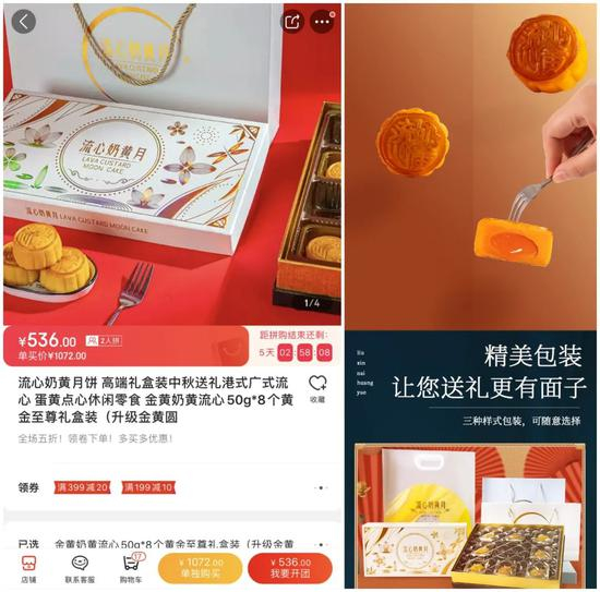 记者在京东购物平台中搜索,发现某商家售卖的一款名为“流心奶黄月饼 黄金至尊礼盒装”的月饼,包装极其精美且价格不菲。该礼盒包含8个重量约为50g的月饼,拼团购买价格为536元。若不选择拼团购买,而是单独购买,则需支付单买价格1072元。也就是说,单块重量约为50克的月饼售卖单价为134元。