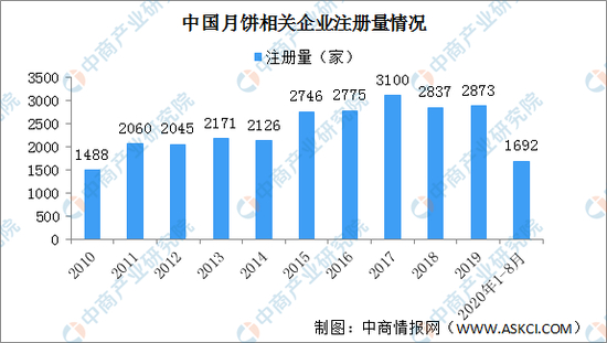 另据企查查数据显示,2010年月饼相关企业注册量不足1500家,2017年突破3000家,2019年新注册量为2873家,与2018年几乎持平。受疫情影响,今年前8个月,我国月饼相关企业注册量是1692家,同比下降了19.1%。