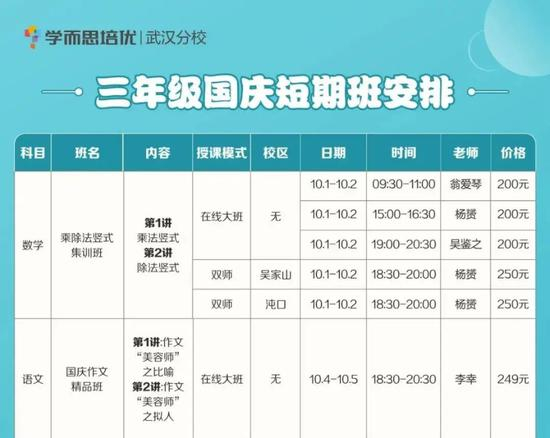 还有部分网课品牌,例如学而思,借助国庆假期,在武汉开办了“十一短期班”的课程,覆盖三到六年级的学生人群。相比于那些“新人”的教育品牌,作为“老人”的巨人教育,在武汉也开展了“十一小灶短训班”,通过三天的学习时间,提供学生们的上课专注能力。