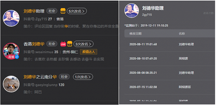 通过新抖数据查询可以发现,这些高仿号往往多次更名,中间相隔的时间也不长。