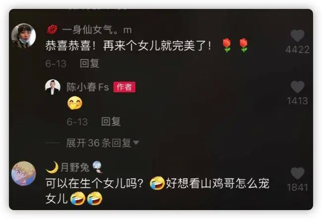 每条视频的评论区,都有很多粉丝把这个账号视作陈小春本人,真情实感地留言表达喜爱,以及对幸福的一家四口的羡慕和祝福。