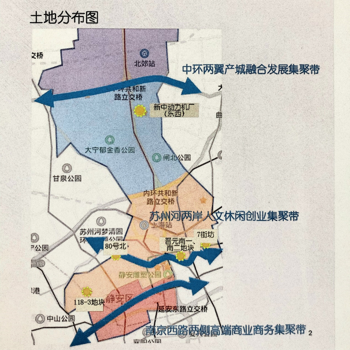 苏州河两岸人文休闲创业集聚带,该聚集带北至铁路沿线,南至新闸路(石门二路以西)--北京西路(石门二路以东),东至罗浮路—河南北路,西至苏州河—安远路—江宁路,占地4.3平方公里。