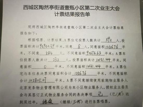 业主大会计票结果显示,居民双过半不同意继续聘用北京发条物业。