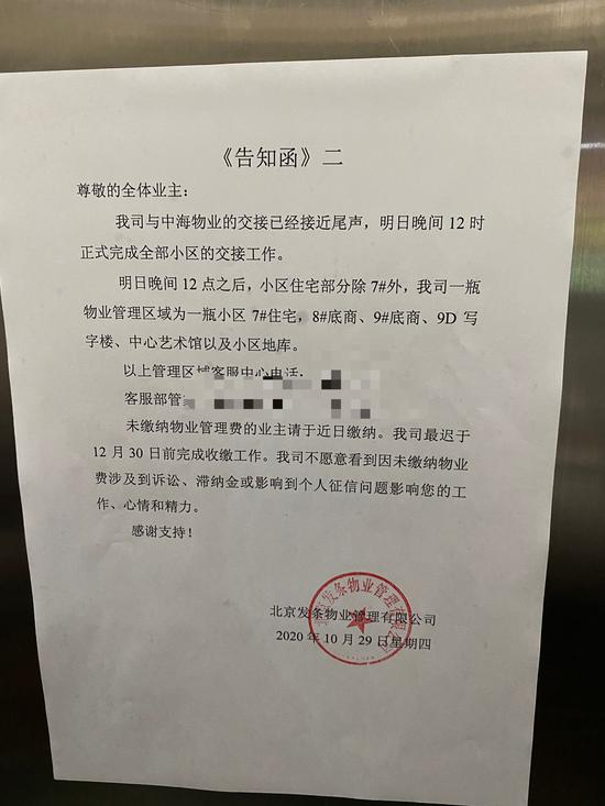 此外,在部分居民楼电梯间内,新京报记者还看到了由北京发条物业公司向全体业主发出的“《告知函》二”,该函称,发条物业与中海物业的交接已经接近尾声,明晚(即10月30日晚间)12时正式完成全部交接工作,此后,除小区住宅部分7#楼外,发条物业物业管理区域还有8#和9#底商、9D写字楼、中心艺术馆以及小区地库。落款时间为10月29日。