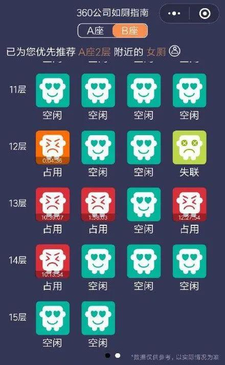 在如何帮助员工更快找到厕所这件事上,360走在了互联网公司的前列。‘我们公司开发了一个‘去哪蹲’的小程序,点开就能看到哪个楼层厕所的坑位是空闲的。’如今,在360工作了4年的钱牧说,开发这个程序也是为了解决员工上厕所的痛点——360园区分为AB两座,A座每层男女厕所都只有3个坑,常常‘人多坑少,坑位靠找’。