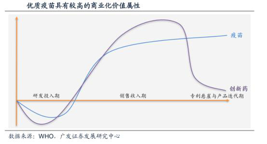 优质疫苗具有较高的商业化价值属性。对于进入收获期的疫苗,能够获得长期稳定的营收。相较创新药,也没有专利失效以及产品迭代带来的价值递减。