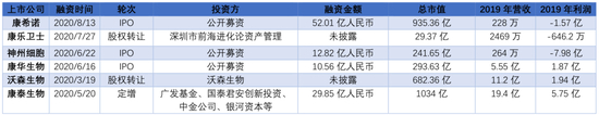6家上市公司中,康希诺、神州细胞核康华生物三家今年完成了IPO。目前总市值中,康泰生物、康希诺、沃森生物排前三。除康希诺外,其它两家在2019年都获得了可观的利润。