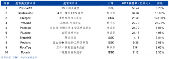 2019全球销售额前十疫苗品种(图源:华金证券)