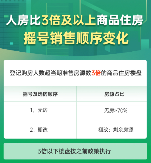 二、登记购房人数在当期准售房源数3倍及以上的,全部房源仅向已报名登记的无房居民家庭及棚改货币化安置住户销售,3倍以下楼盘按照之前政策执行。