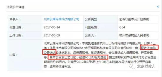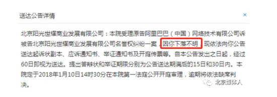 野马财经随后联系杭州市滨江区法院,法院告知,因原告阿里巴巴称野马财经下落不明,未提供被告联系人及电话,所以采取了公告送达。