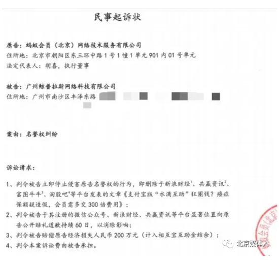 2020年4月,自媒体“观点”质疑“相互宝”,同样遭到蚂蚁集团的起诉,要求“观点”删文、道歉、并索赔200万。