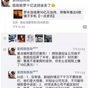 2017年8月,锤子科技宣布完成10亿元融资。锤子科技早期投资人、紫辉创投创始合伙人郑刚却在朋友圈里说道:“(锤子)差点被阿里巴巴害死!!明知道创业公司拖不起,前前后后弄了半年,最后说不!要是不是紫辉的坚持,你怎么在陌陌上赚了10亿美元!!”