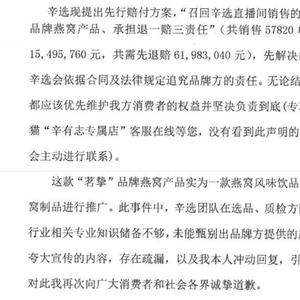 辛巴再次回应+甩锅:有燕窝成分唾液酸,我司不涉及任何采购销售行为,可以申请退款。11月27日,辛巴第三纸声明发出,表示退一赔三。