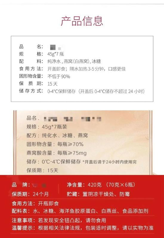 祁杭给深燃发来了到货产品的实物照片,“那就是糖水,哪有什么燕条和固体物”。他表示,他收到的货品里,固体物只有2%甚至更少,和包装上的标注明显不符。