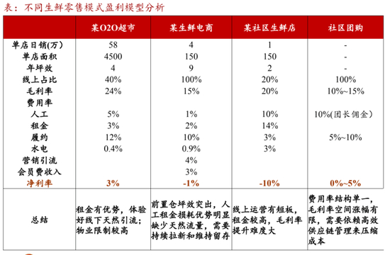 招商证券的一份研报将O2O超市、生鲜电商、社区生鲜店、社区团购的盈利模型做了对比分析。研究结果表明,在这四种模型中,只有社区团购和O2O超市净利率为正,而且社区团购是个更加轻资产的模型。