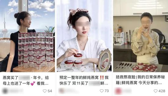 种草平台上,不少年轻姑娘展示着自己“日啖燕窝一瓷碗,不辞长作小仙女”的精致生活,声称自己20岁的好皮肤都是吃燕窝吃出来的,为此不惜办年卡、预订能摞一面墙的鲜炖燕窝。