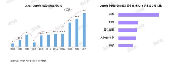 燕窝市场随之迎来了不小的增长。数据显示,近年来的年复合增长率达到30%以上,2019年整体市场规模达300亿左右。在滋补养生类目中,燕窝一骑绝尘,成交额占比近三成。