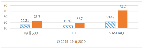 对冲疫情大冲击的宏观政策,直接带来了美国金融市场资产价格的超级修复。截止2020年12月6日,美国三大股指标普500、DJ和NASDAQ的PE(TTM)分别为35.7、29.2和72.2,分别比2015-2019年年均PE上升了约60.0%、46.1%和115.6%(图1)。与此同时,标普500、DJ和NASDAQ的P/B分别达到3.96倍、6.33倍和6.16倍。美国股指中DJ已经突破3万点大关,创历史新高,截止12月4日收盘,达到了30218.26点;NASDAQ屡创新高,达到12464.23点;标普500也创历史新高,达到3699.12点。美国股市的涨幅不仅收复了年初至3月中下旬金融大动荡的跌幅,反而屡创新高。截止12月4日,美国股市上市公司家数达到5139家,市值超过55万亿美元,占据了全球股市55%以上的市值,成为全球的超级股票市场。