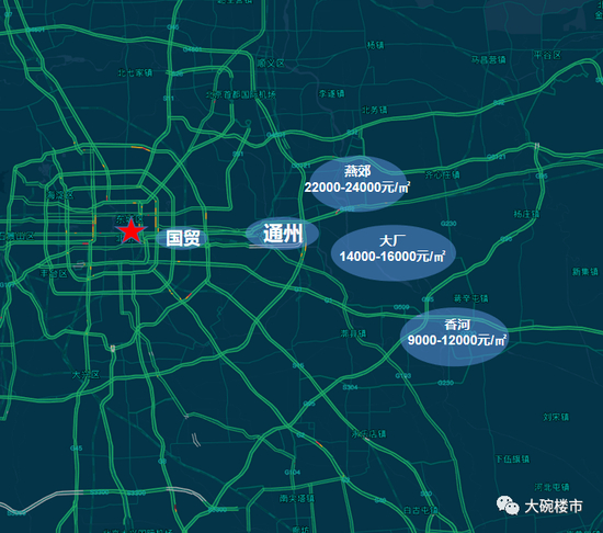 国贸均价10万/㎡;通州新房均价6万/㎡,而香河只有9000元/㎡。