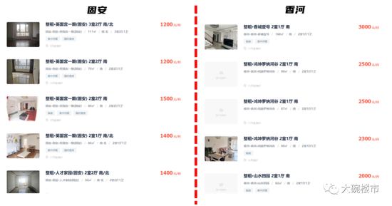下面这张图,是香河和固安的租金水平对比——