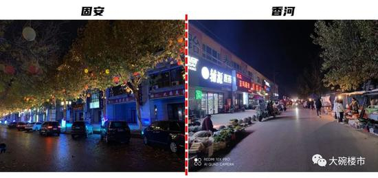 下面这张图,是香河和固安在晚上8:30分的亮灯率实拍——