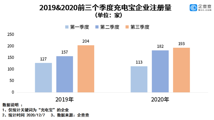 企查查数据显示,2020年前三季度,充电宝相关企业一共新注册488家,与去年同期数据持平。其中,第一季度注册量是113家,第二季度注册量是182家,第三季度注册量是193家。