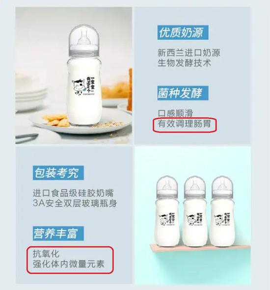 在微信商城,初饮公司宣称,“我还是个宝宝”酸奶饮品采用新西兰进口奶源生物发酵技术,“有效调理肠胃,营养丰富,抗氧化,强化体内微量元素”,适饮人群包括儿童、少年、忙碌上班族、中老年人。